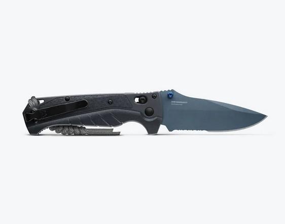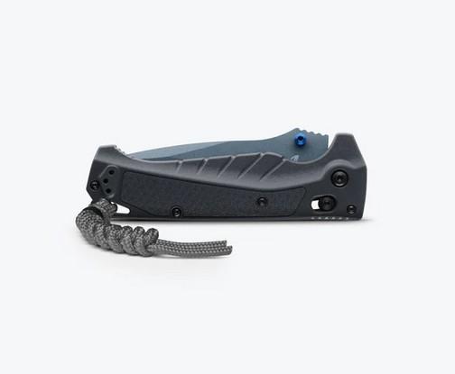 Rough-ready handle & build: The handle scales are textured Grivory in a subtle Tempest Gray finish with a gray paracord lanyard, offering grip in wet or dry conditions and quick access when needed.