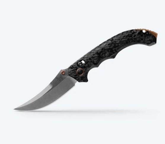 The Benchmade 865-02 Mini Bedlam brings the aggressive design of the Bedlam series into a carry-friendly size while retaining high-end materials and tactical appeal. With a 3.45″ CPM-S90V stainless steel scimitar-style blade and marbled carbon fiber handle scales, this model delivers top-tier edge retention and visual finesse.