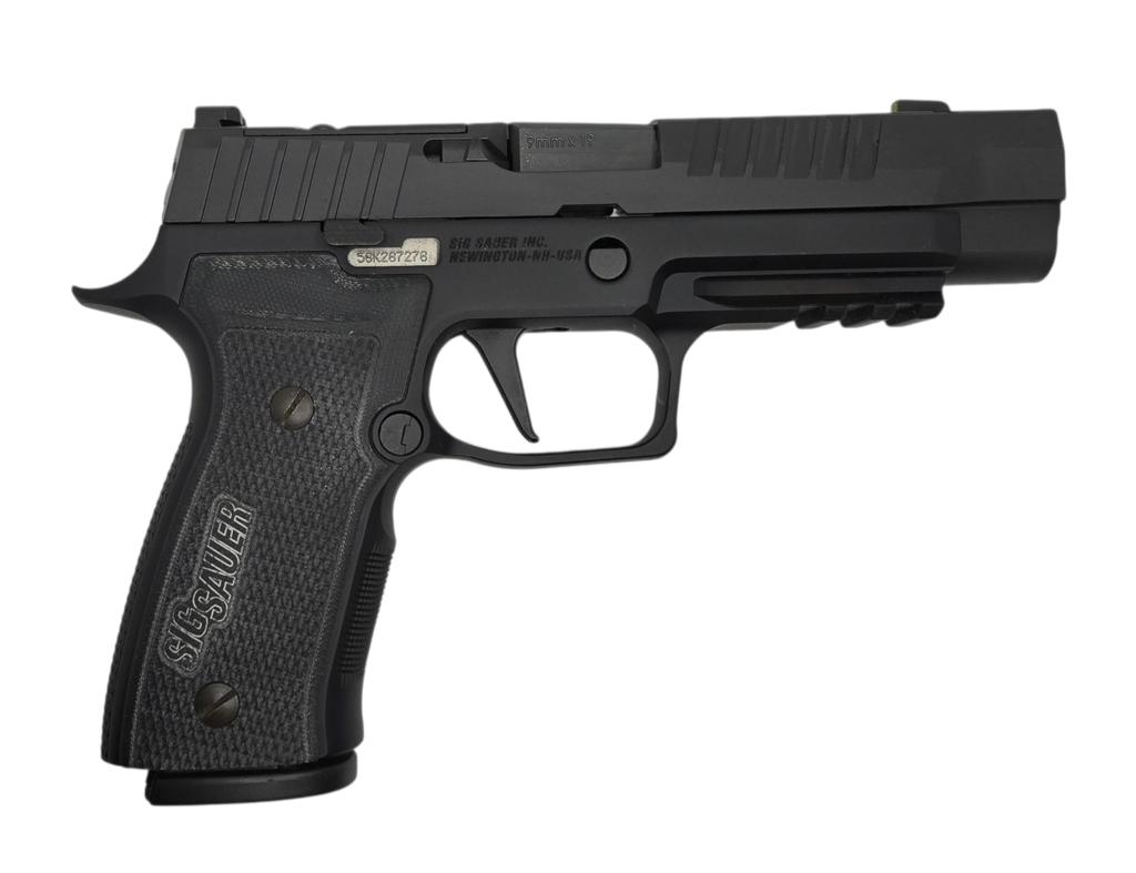The P320 AXG Legion sets a new standard in modular, metal-frame pistols. With its robust alloy AXG frame, ported slide, and precision flat trigger, it offers competition-ready control and carry-ready durability. The optic-ready slide makes it easy to mount your preferred red dot, while the custom grips and extended magwell offer exceptional handling and fast reloads.